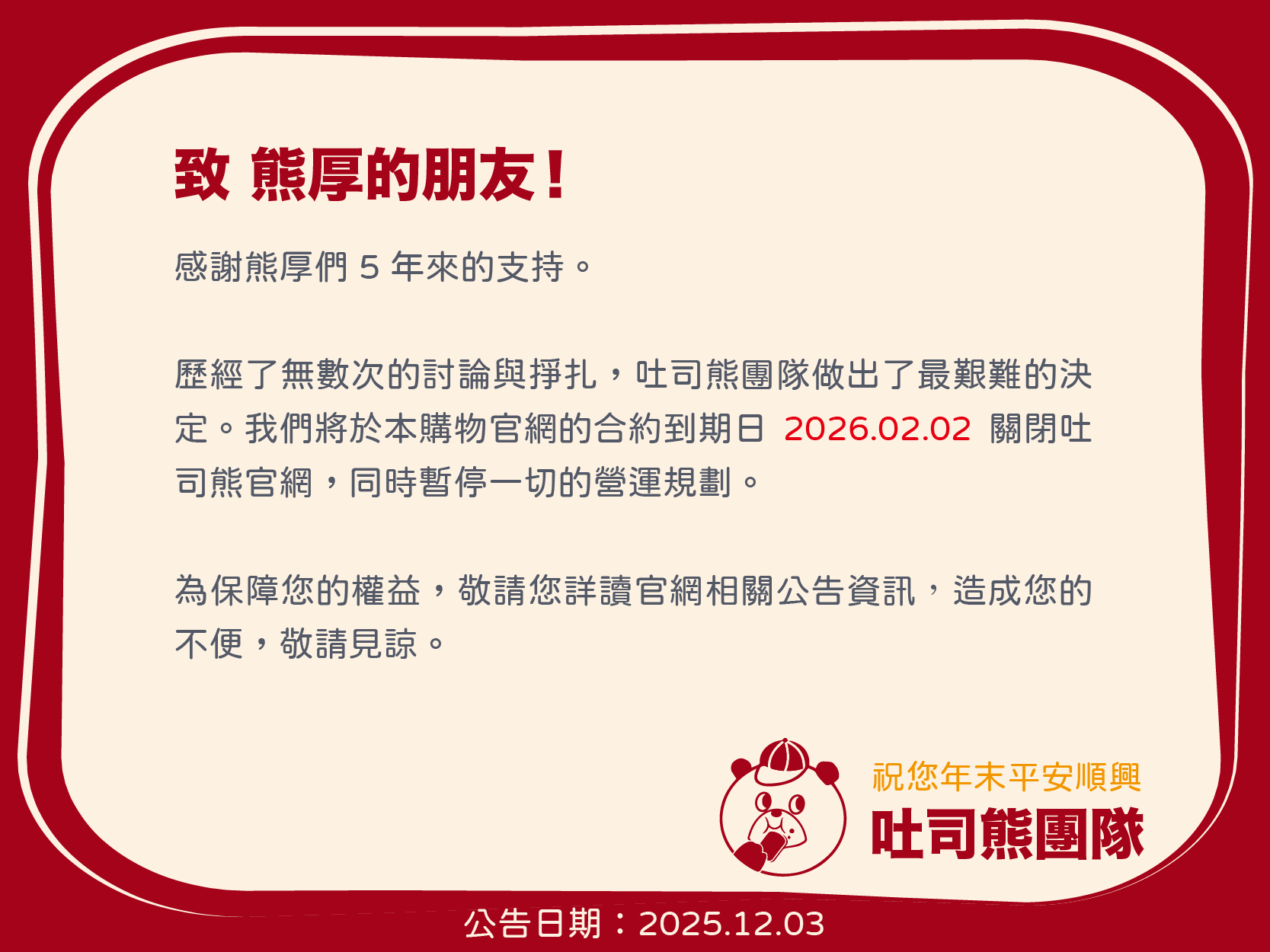 承擔著不同壓力與身份責任的你,是否忙到沒有時間好好療癒自己?請讓吐司熊的「手工厚抹奶酥吐司」,獻上療癒級的香濃乳香,療癒您的心靈與味蕾。吐司熊經過測試再測試,終於製成擁有「便利的食用方式」、「無痛重現現做級美味」、「易於保存」等優點的冷凍吐司。讓您在忙碌的生活中,解放雙手與煩亂的思緒,輕鬆獲得滿足與飽足感。