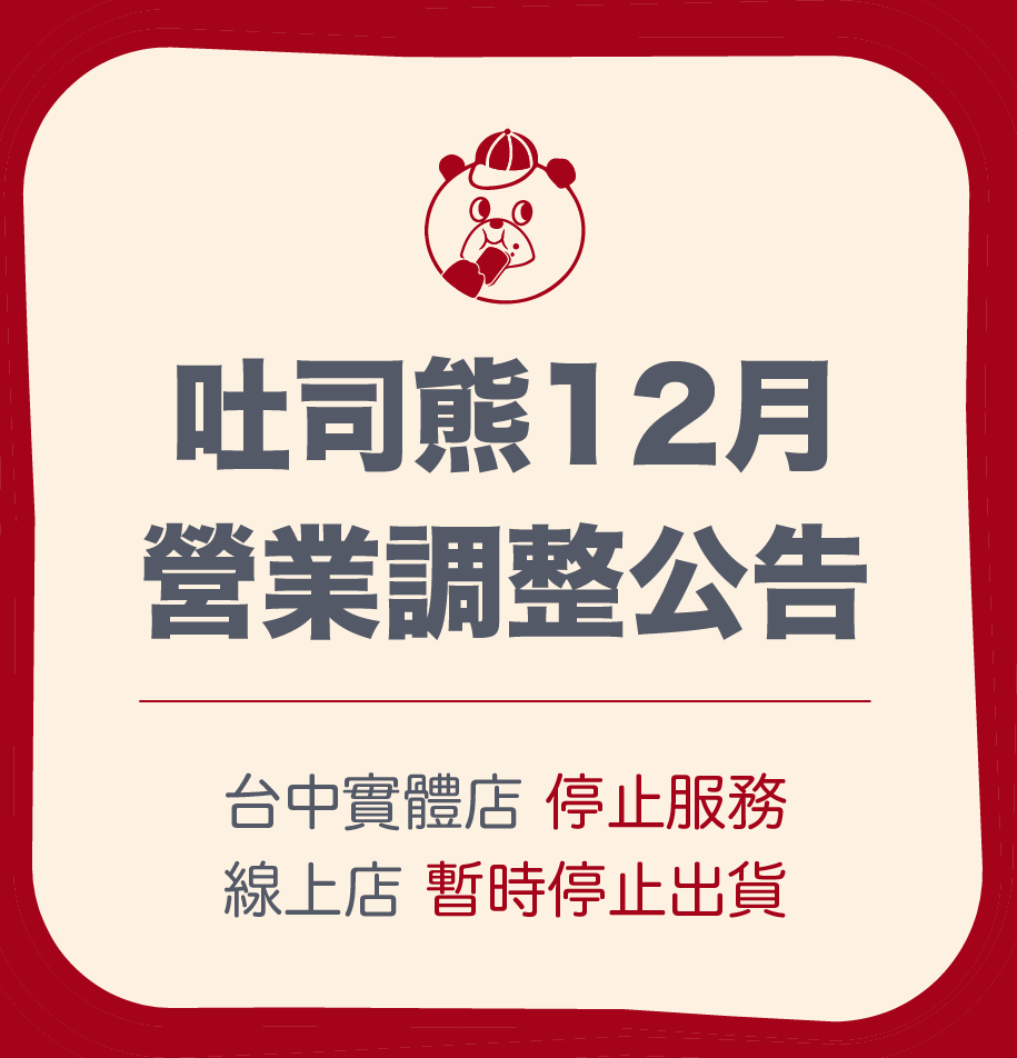 感謝各位客人長久以來的支持🥹 我們知道我們遠遠做得還不夠好 因此將迎來更多夥伴加入吐司熊大家庭 希望在未來給予更優質的服務與更好的商品 🍞台中實體店面的租約到期,因此關閉實體店面的現烤與飲料等服務 但感謝各位喜歡我們的客人的支持 我們將於台南開設第二個工作室,以增加產能,並服務南部的客人 未來"台中地區",與"台南地區"將會分別公告地方性的取貨與外送服務 🍞再次感謝各位長久以來的包容與鼓勵 我們將會持續改進與迎向更好的吐司熊 👉為協助台南工作室的成立,網路訂單12月暫時停止出貨與下單。 📣11/29前的訂單將會於11/30前全數出完📣,請各位已下訂單的客人放心
