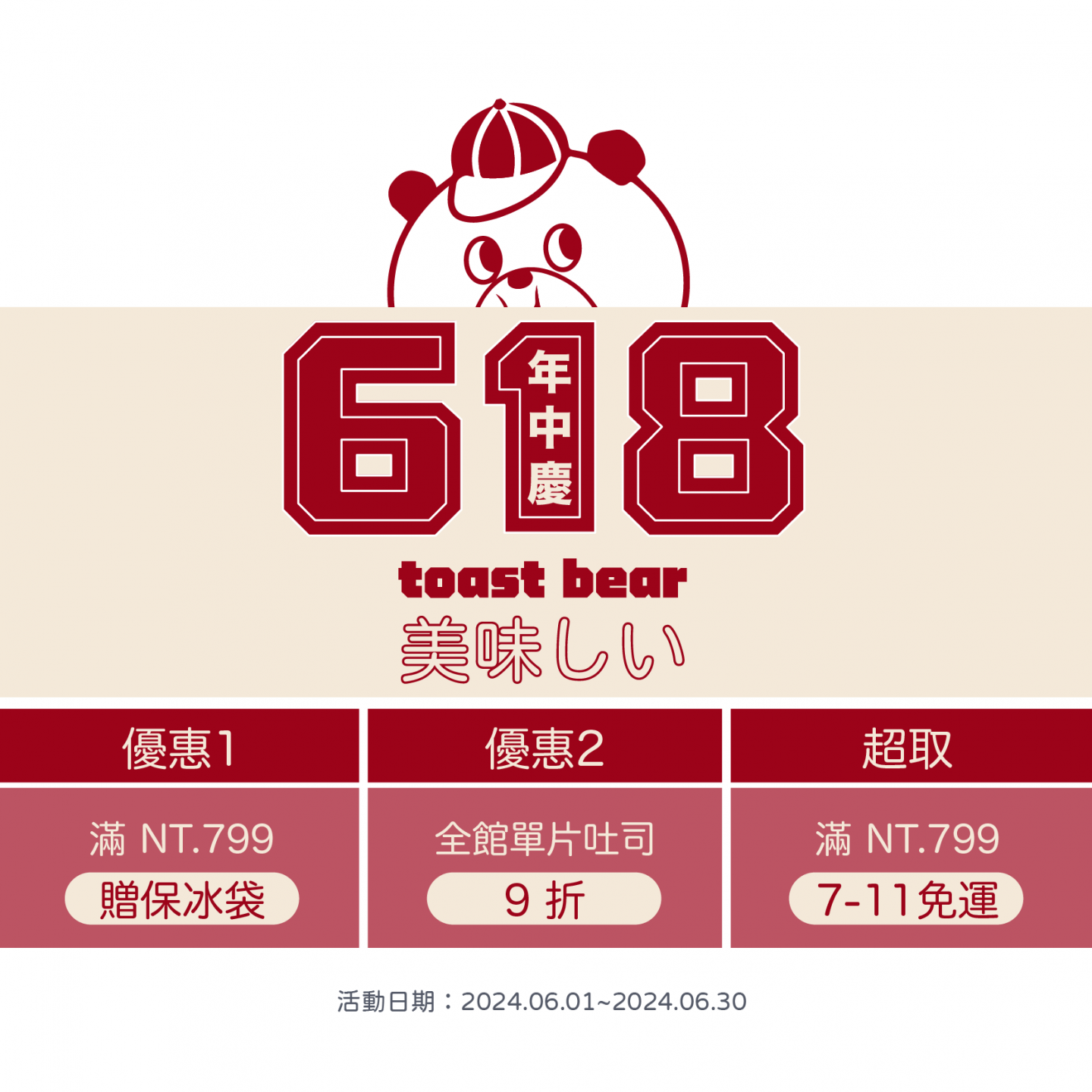 【618 年中慶】 【優惠內容】 優惠1:全館單片吐司 9 折 優惠2:單筆訂單金額滿 799 元 贈熊寶保冰袋(可累贈) *超商取貨滿 799 元即可享免運優惠唷! 【活動詳細資訊】 活動日期:即日起至 2024.06.30 止 優惠1說明:9 折優惠不含組合(不含免運優惠組合、輕量禮物組合),依系統顯示金額為主。 優惠2說明:單筆結帳金額滿 799 元贈熊寶保冰袋 乙個(原價 NT.250 ) 熊寶寶冰袋可累贈,例:結帳金額滿 NT.1598 贈兩個、滿 NT.2397 贈三個,依此類推。 *如有未竟事宜,吐司熊保有解釋活動之權益。 【立即逛逛】